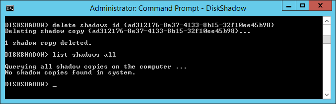 Once it has been deleted, we can confirm there are no more shadow copies lying around using DiskShadow: