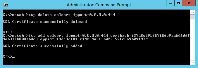 Nothing suspicious at first sight, but then again, I can't remember the last time I ran this command so I wasn't exactly sure what to look for. Until I ran the same command on a healthy server and noticed that the certificates used for 443 and 444 were the same: